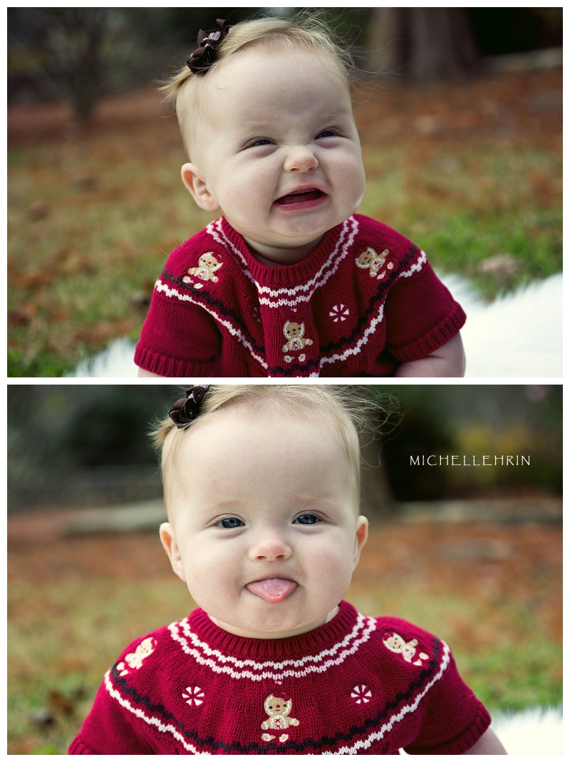 We have been so lucky here in North Carolina this Holiday Season because it has been so warm and that’s awesome because what is cuter than some baby skin? This sweet baby girl cracked me up and kept me shooting because she had so many funny faces. Plus, she did us the honor of mastering her sitting skills just before her 6 month session! Her parents are great too and we had a lot of fun! Can I mention how much I LOVE baby sessions by the way. They are just so cute for so many reasons but one of the main ones is what she brought, her funny faces.